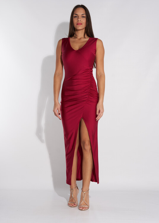 Envy Ujjatlan, derekán aszimmetrikusan húzott maxi ruha bordó