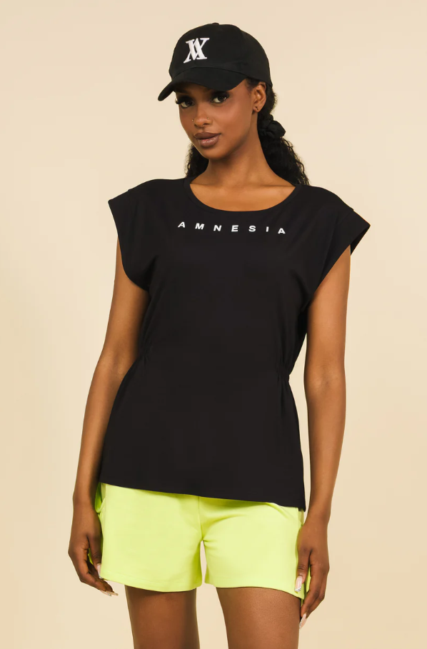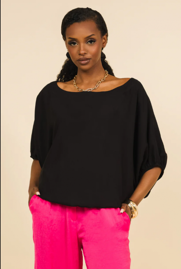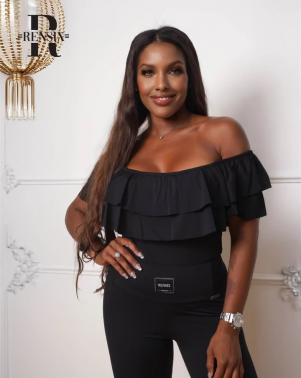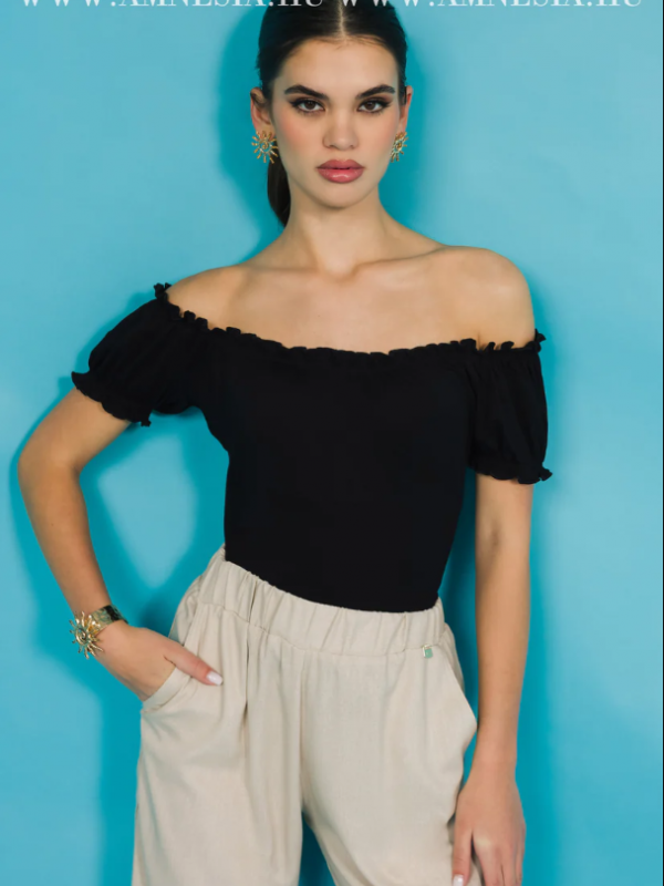 Rensix póló csónaknyakú vállralehúzós dupla fodros fekete 2025