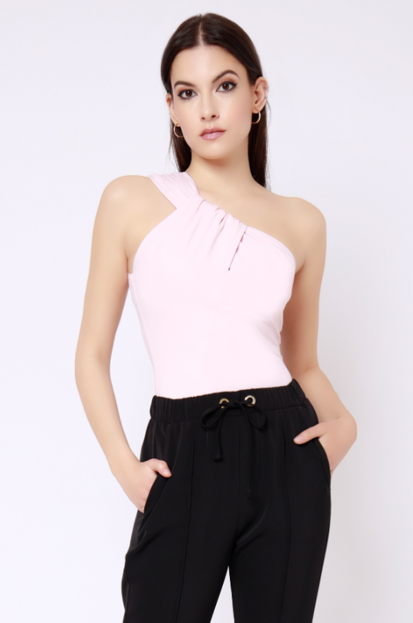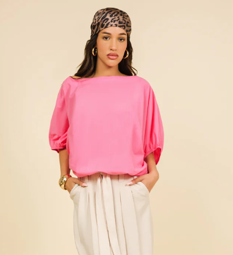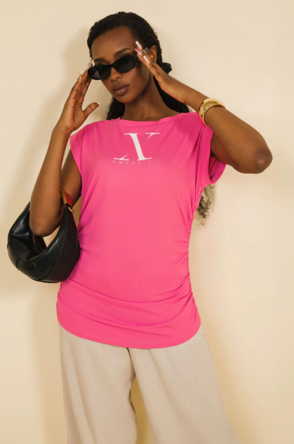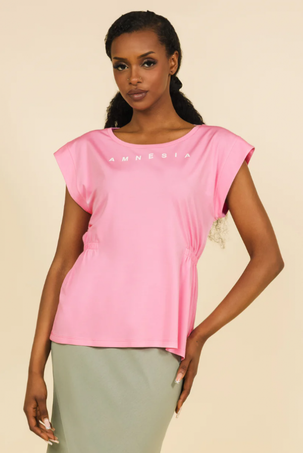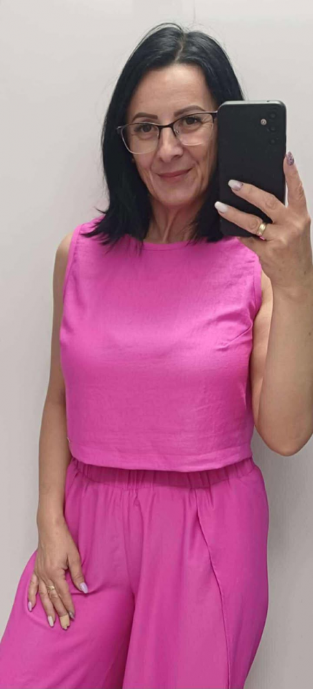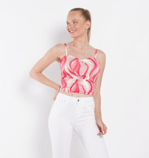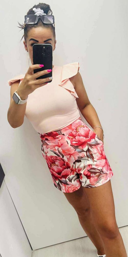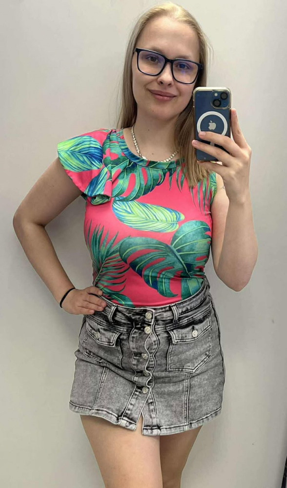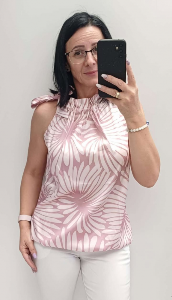 Rensix felső kereknyakú fél vállfodros mintás pink alapon pálmaleveles 2025