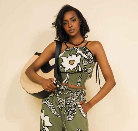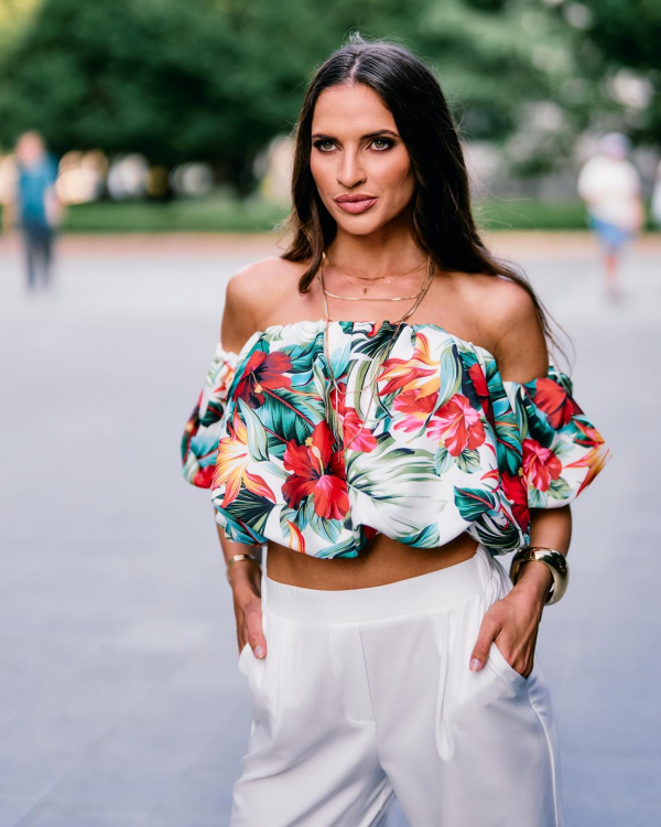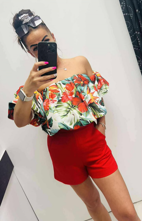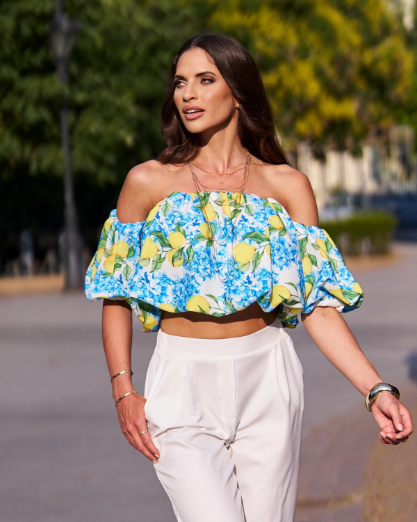 Envy crop top Ejtett vállú, gumis ujjú trópusi mintás