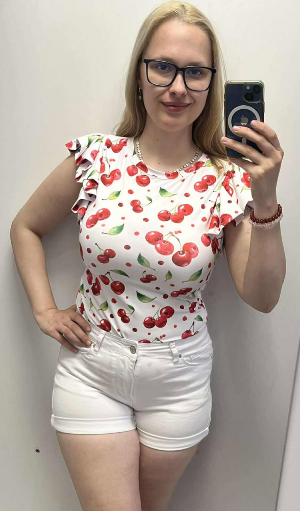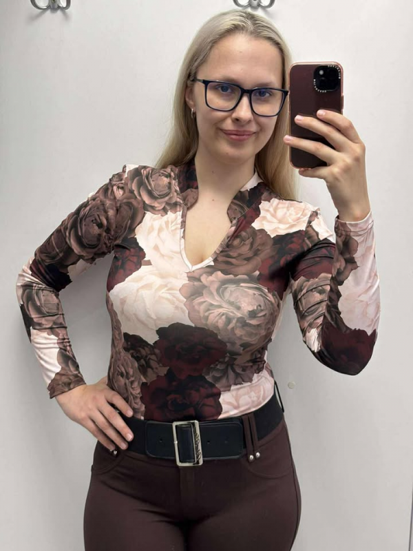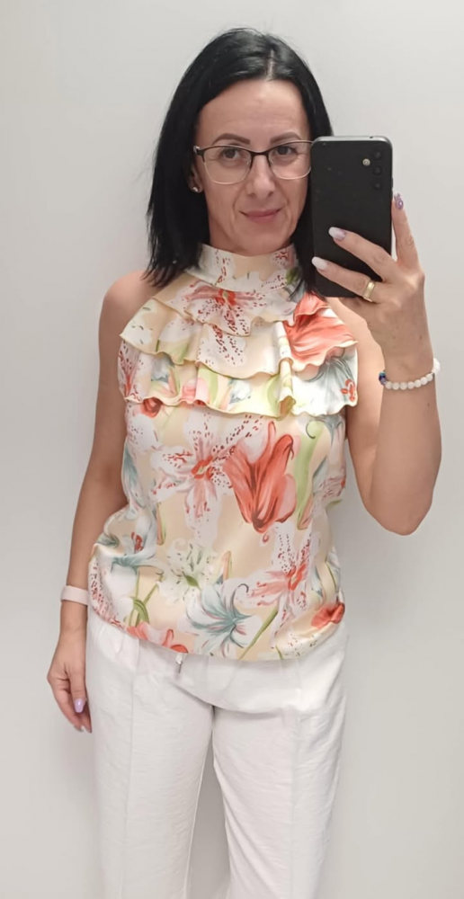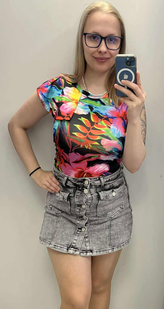 Rensix felső kereknyakú fél vállfodros mintás fekete alapon színes virág 2025