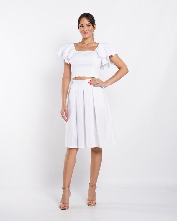 Envy szett A vonalú szoknya+fodros vállú crop top fehér